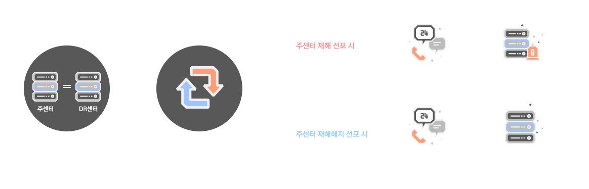 - 지진, 화재와 같은 천재지변이나 테러, 해킹, 사이버 공격 등 각종 재난, 재해로 인해 데이터센터 등 이용기관의 IT 인프라에 장애가 발생하여 제 기능을 수행하지 못하게 되었을때 이를 대체하거나 복구하여 서비스의 연속성을 확보하고 있습니다.